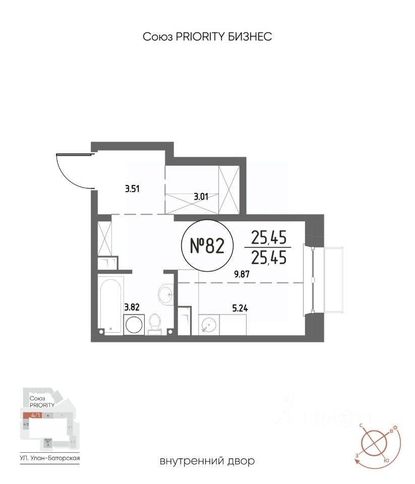 Продаётся 1-комнатная квартира в строящемся доме (Дом 4), срок сдачи: III-кв. 2029, общей площадью 25.45 кв.м., на 7 этаже. Мы начали с эталона - жилого комплекса Союз Priority, лучшего в России. А теперь представляем его логичное и яркое продолжение Союз Priority MAX. Наследие качества: Проверенные материалы, безопасные дворы, изысканные подъезды. Дух современности: Технологичные решения, демократичная атмосфера, энергия большого города. Ваше комьюнити: Это больше чем дом. Это точка притяжения для вашей семьи, друзей и тех, кто разделяет ваши ценности