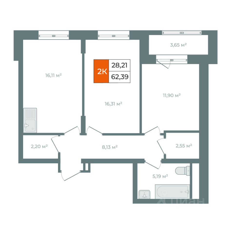 О КВАРТИРЕ: Площадь 66м2 Эргономичная планировка, комнаты площадью 16,31м2 + 11,90м2 с выходом на балкон. Кухня-гостиная 16,11м2 2 гардеробных комнаты 2,20м2 + 2,55м2 Большой санузел 5,19м2