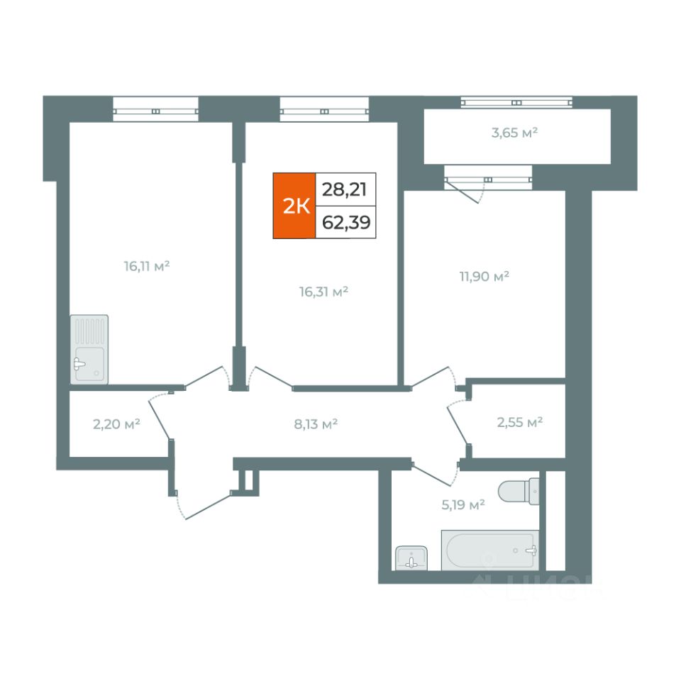 О КВАРТИРЕ: Площадь 66м2 Эргономичная планировка, комнаты площадью 16,31м2 + 11,90м2 с выходом на балкон. Кухня-гостиная 16,11м2 2 гардеробных комнаты 2,20м2 + 2,55м2 Большой санузел 5,19м2