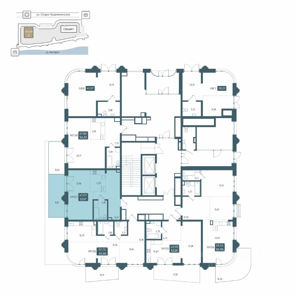 Общая площадь57,57 м2