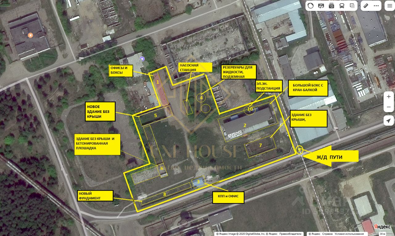 На территории производственной базы расположены следующие объекты недвижимости: 1 ) Объект 2005 (механосборочный цех ) - 1630 м2 2) Столярный цех (объект незавершенного строительства) - 624 м2 3) Здание офис-гараж с холодным пристроем - 1013 м2 4) Складское помещение с бетонированной площадкой 800 кв.м. 5) Административное здание - 91 м2. 6) Насосная с подземными резервуарами. 7) Комплектная трансформаторная подстанция КТПН-К-В-ООУ1-630/6/0,4 7750. 8) Рядом ж/д ветка