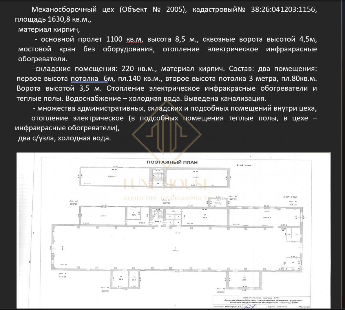 1) Механосборочный цех (объект 2005) площадь 1630,8 кв.м, материал кирпич, - основной пролет 1100 кв.м, высота 8,5 м., сквозные ворота высотой 4,5м, мостовой кран без оборудования, отопление электрическое инфракрасные обогреватели. -складские помещения: 220 кв.м., материал кирпич. Состав: два помещения: первое высота потолка 6м, пл.140 кв.м., второе высота потолка 3 метра, пл.80кв.м. Ворота высотой 3,5 м. Отопление электрическое инфракрасные обогреватели и теплые полы. Водоснабжение холодная вода. Выведена канализация. -множество административных, складских и подсобных помещений внутри цеха, отопление электрическое (в подсобных помещениях теплые полы, в цехе инфракрасные обогреватели), два сан/узла, холодная вода.