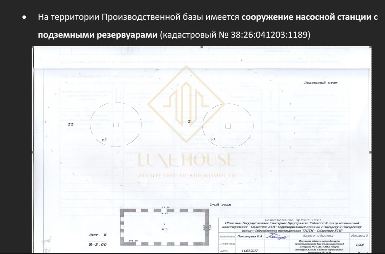 Технические условия: Водоснабжение центральное холодная вода (питьевая вода), на горячее водоснабжение в помещениях установлены водонагревательные котлы, Канализация центральная, Электроснабжение собственная подстанция мощностью 630 КВА, находящаяся на территории производственной базы. Отопление электрическое -- в административных помещениях система электрического обогрева реализована с помощью резистивного нагревательного кабеля DEVIflex-20, смонтированного в основании пола, для устройства функции основного отопления и возможности аккумуляции тепла . Регулировка и управление осуществляется отдельно по помещениям с помощью силовых шкафов управления и контроллеров DEVI smart, которые могут управляться удаленно оператором. - в производственных помещениях обогрев осуществляется при помощи инфракрасных обогревателей. Наружное освещение территории производственной базы осуществляется энергосберегающими прожекторами. Подъездные пути и внутренние проезды: -- асфальтированная дорога до ворот базы, -- бетонная площадка при въезде на территорию базы, -- асфальтированная площадка напротив здания -гаража. -- До федеральной трассы 3,5 км. -- До центра г. Ангарска 4 км.