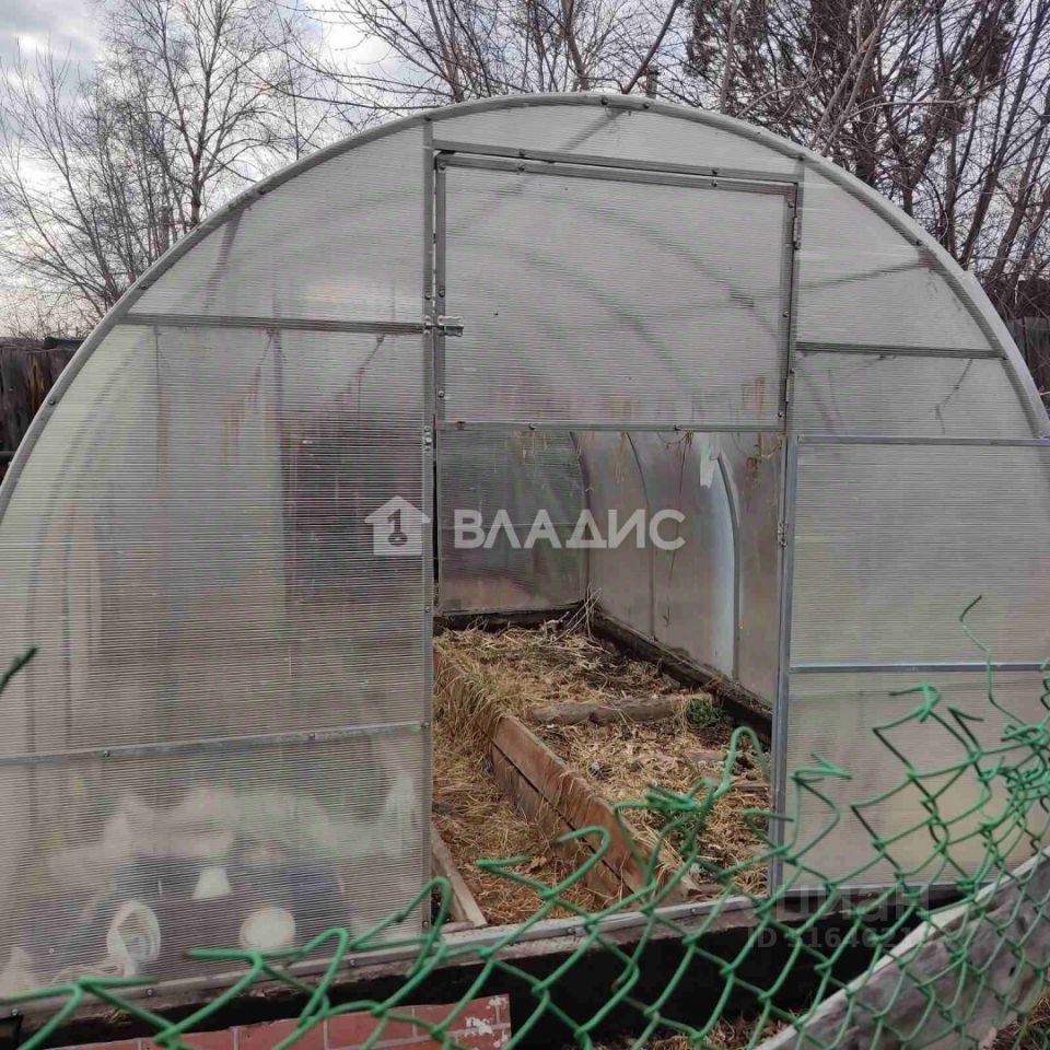 На участке теплица из поликарбоната, помещение для инвентаря, грядки, насаждения, земля плодородная.
