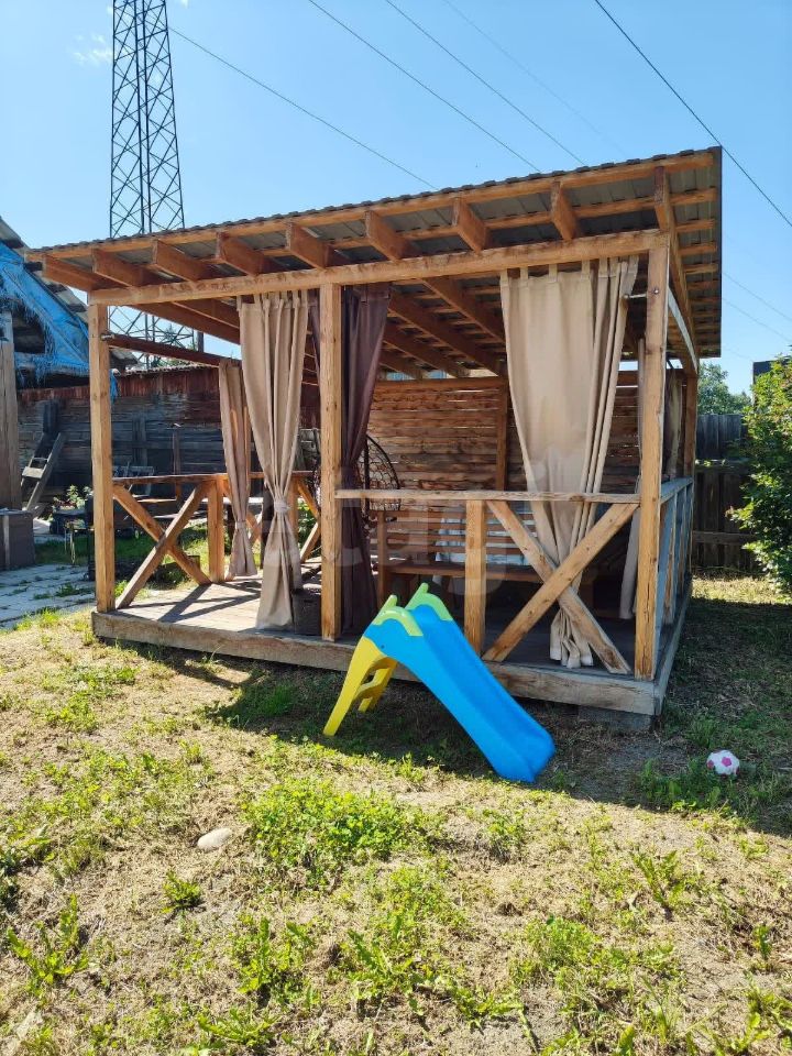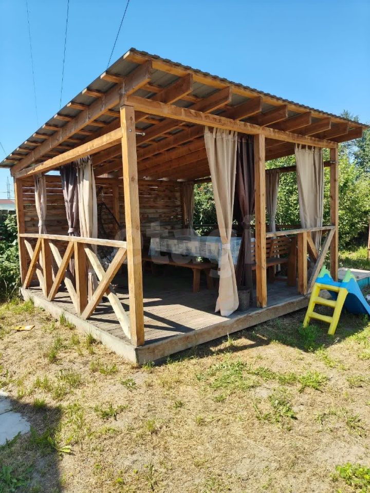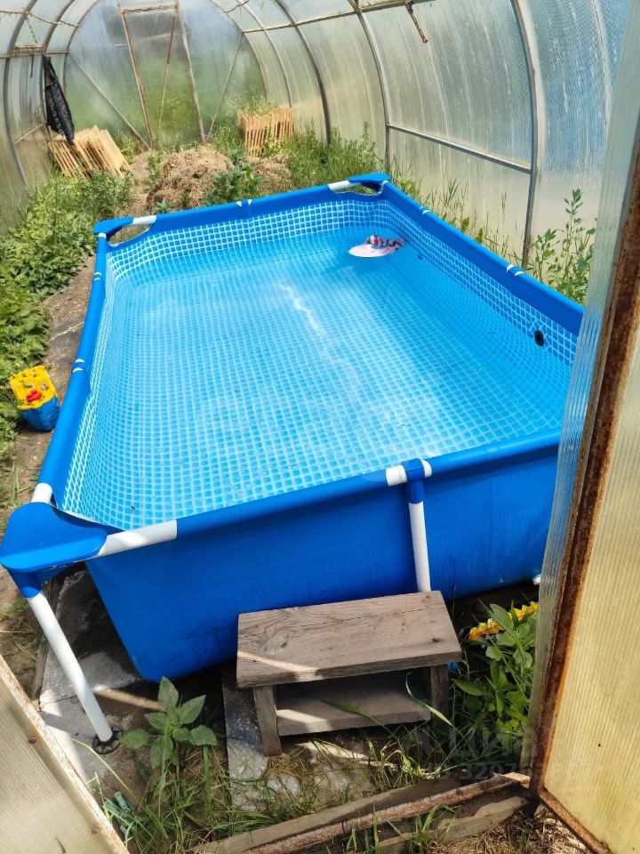На участке расположена просторная деревянная беседка 44 метра с мебелью, мангальная зона для приготовления пищи на открытом воздухе, детская площадка с песочницей и батутом, каркасный бассейн. Также имеется теплица из поликарбоната длиной 5 метров.