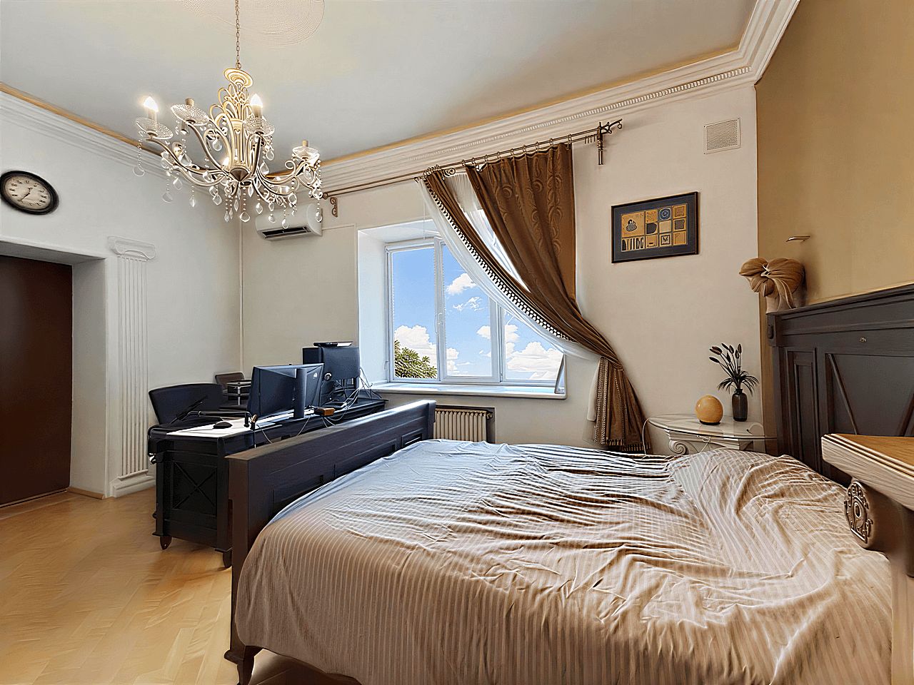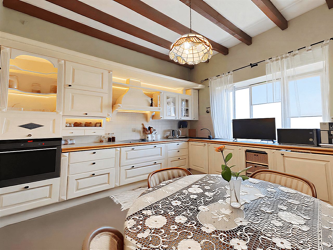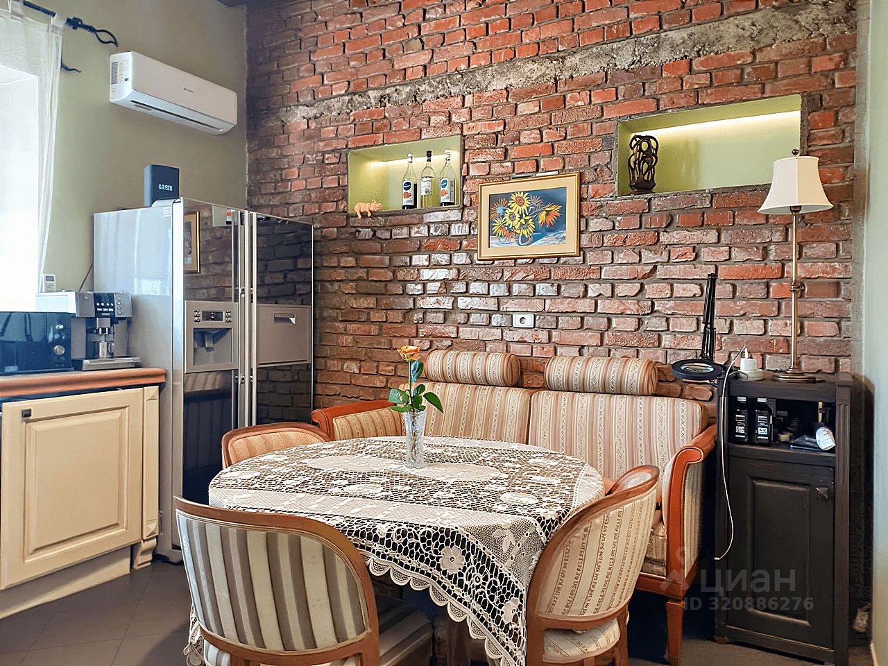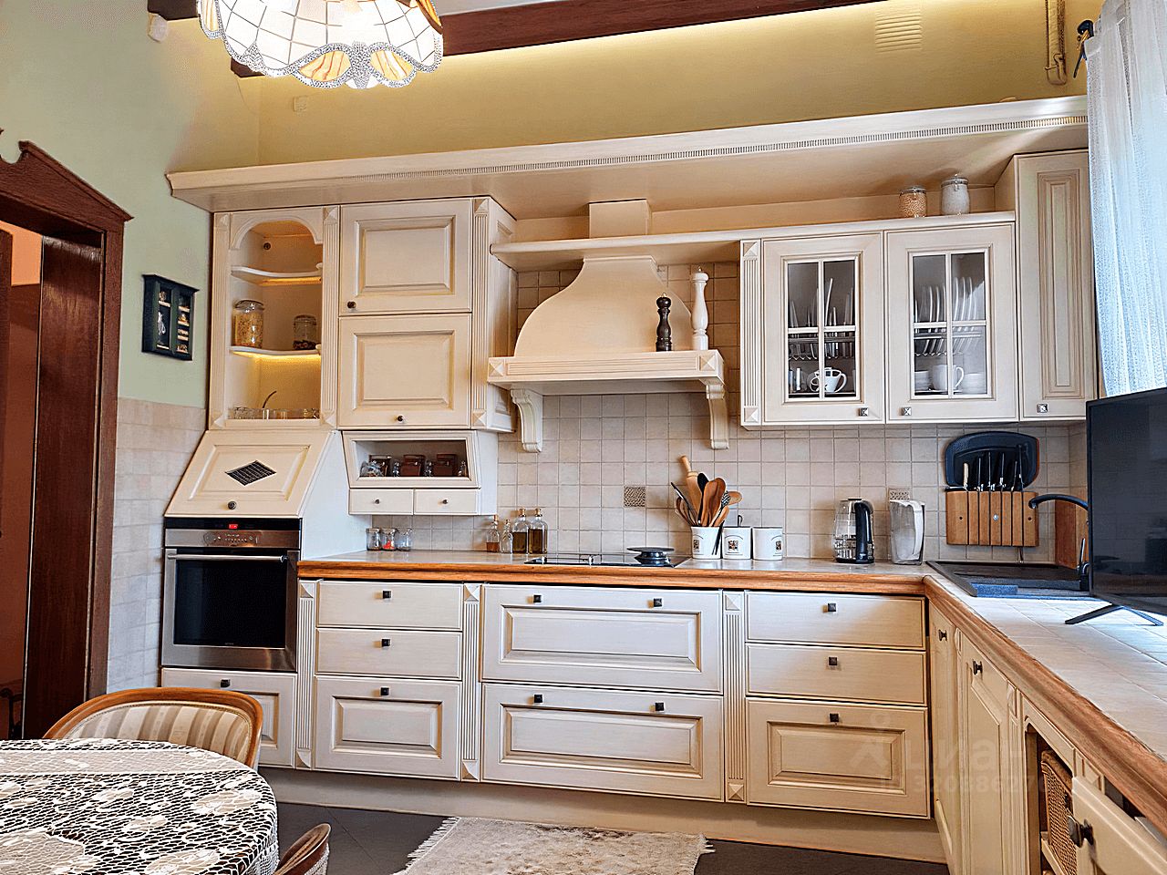 Современный кухонный гарнитур с электропечью. Шесть стульев и вместительный холодильник. Удобная кровать, угловой стол и комод. Телевизор для приятных вечеров. Особый шарм придаёт мебель ручной работы. Комфортный микроклимат обеспечат три кондиционера.