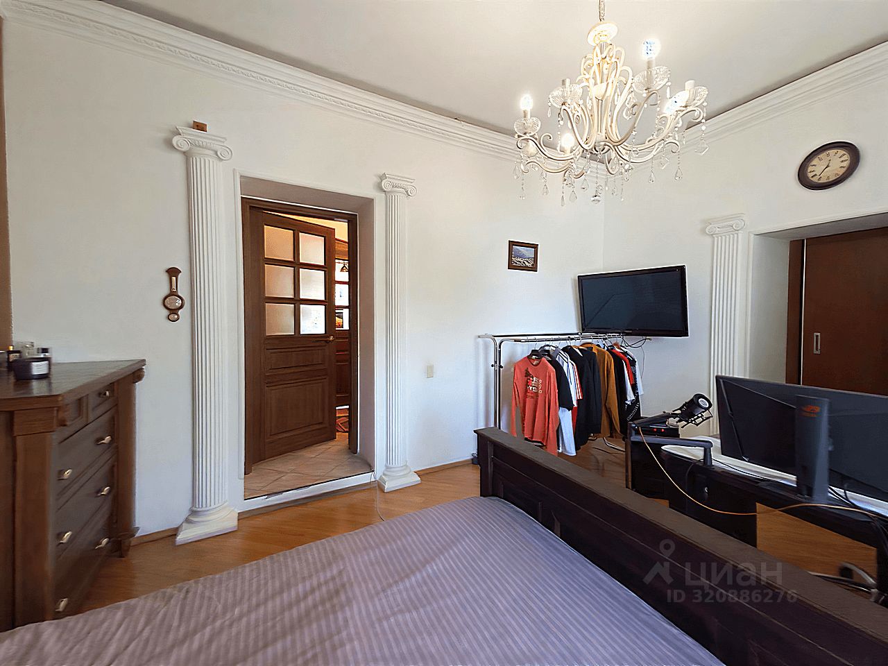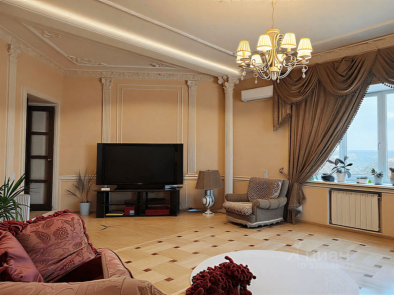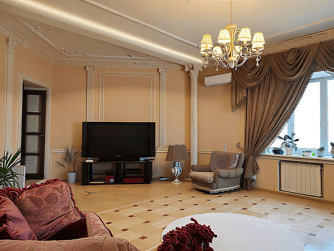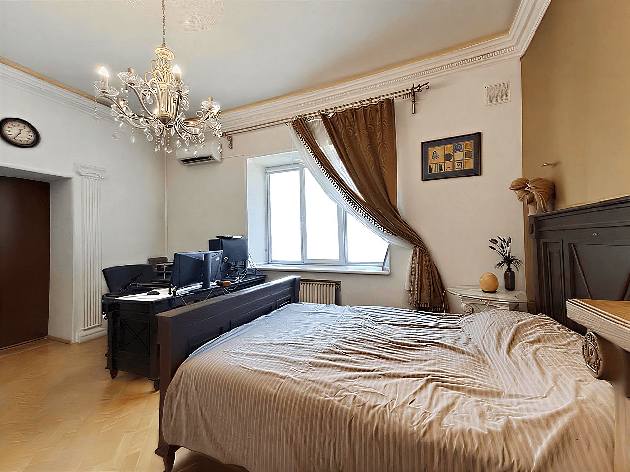 Современный кухонный гарнитур с электропечью. Шесть стульев и вместительный холодильник. Удобная кровать, угловой стол и комод. Телевизор для приятных вечеров. Особый шарм придаёт мебель ручной работы. Комфортный микроклимат обеспечат три кондиционера.