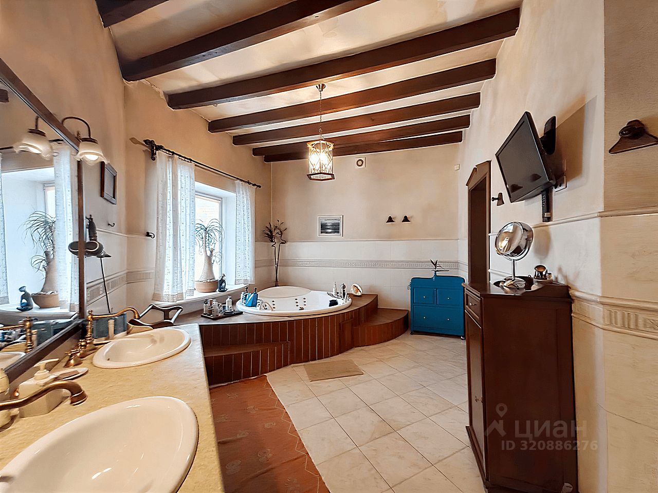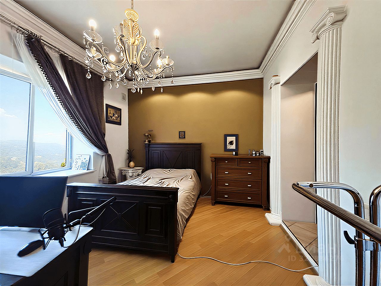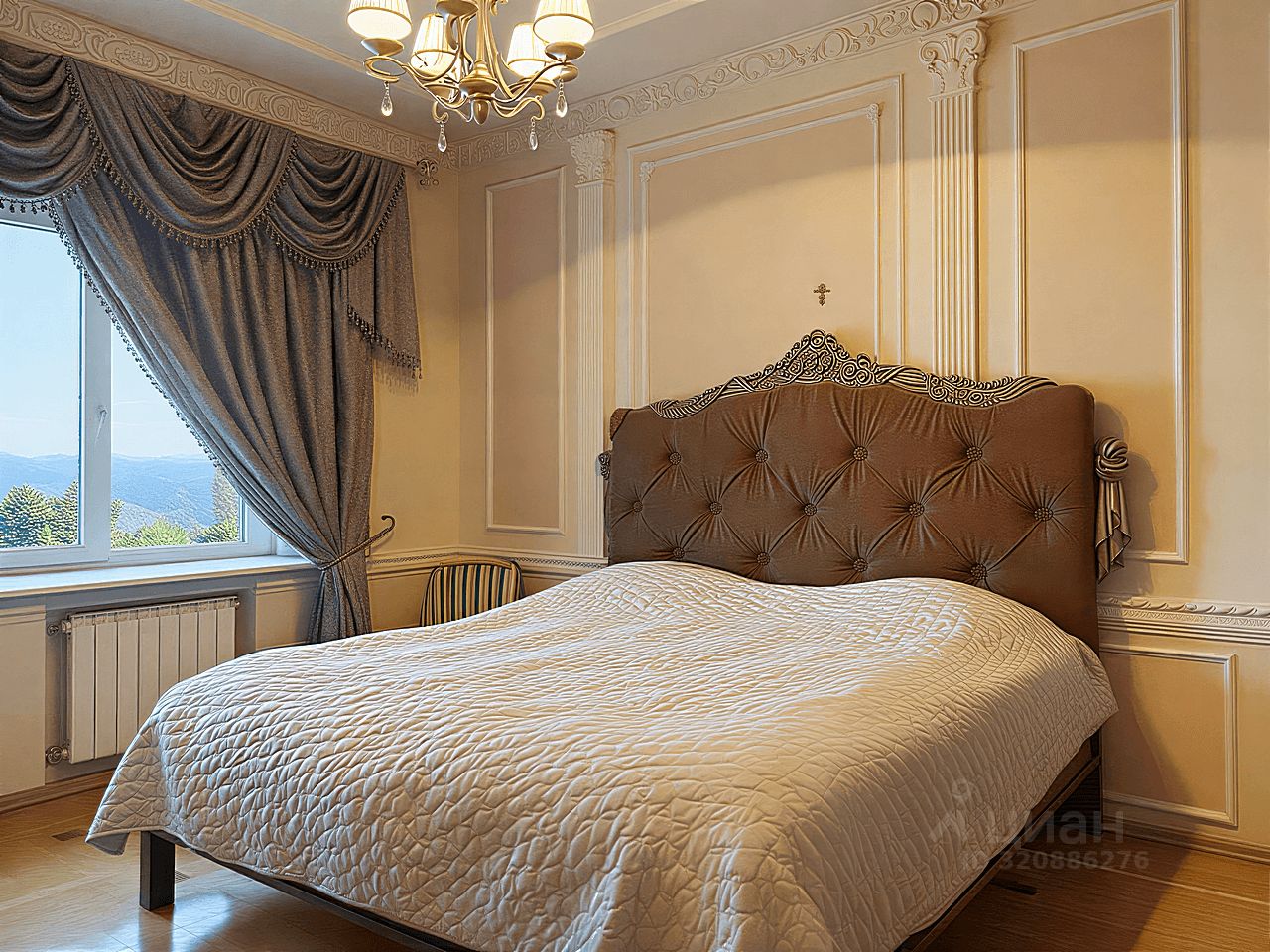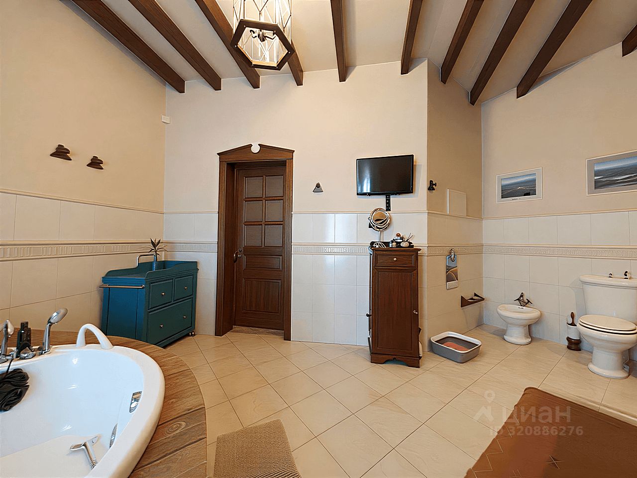Современный кухонный гарнитур с электропечью. Шесть стульев и вместительный холодильник. Удобная кровать, угловой стол и комод. Телевизор для приятных вечеров. Особый шарм придаёт мебель ручной работы. Комфортный микроклимат обеспечат три кондиционера.