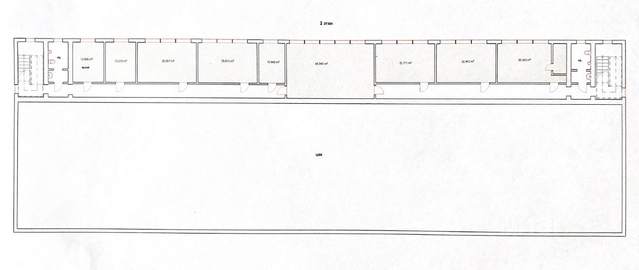 На 2 этаже расположены 2 сан.узла, кухня и несколько офисных помещений от 12 м.кв.