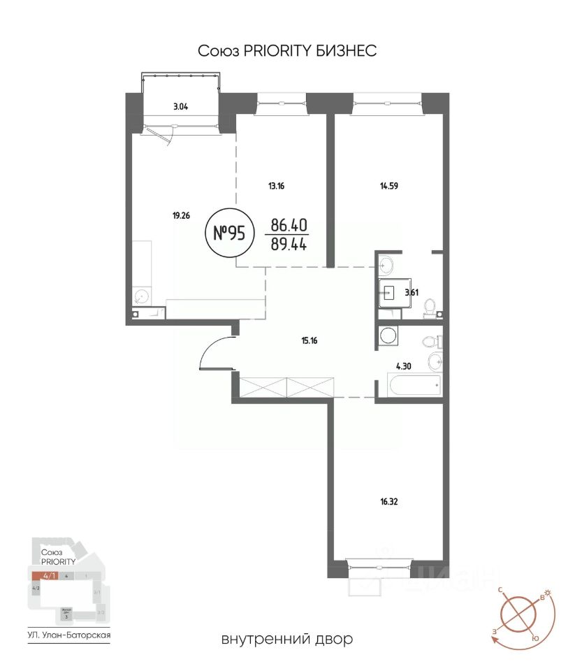 Продаётся 3-комнатная квартира в строящемся доме (Дом 4), срок сдачи: III-кв. 2029, общей площадью 89.44 кв.м., на 7 этаже. Мы начали с эталона - жилого комплекса Союз Priority, лучшего в России. А теперь представляем его логичное и яркое продолжение Союз Priority MAX.