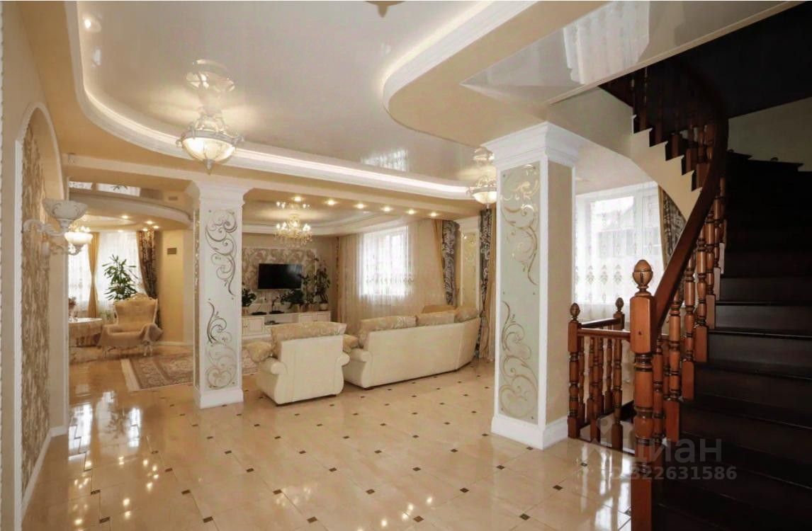 Планировка: первый этаж просторная кухня, гостиная, гардеробные и бытовые помещения, гостевой сан. узел, на втором этаже расположены три спальни, гардеробная и бильярдная.