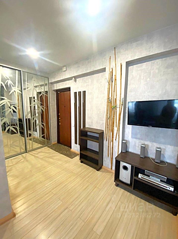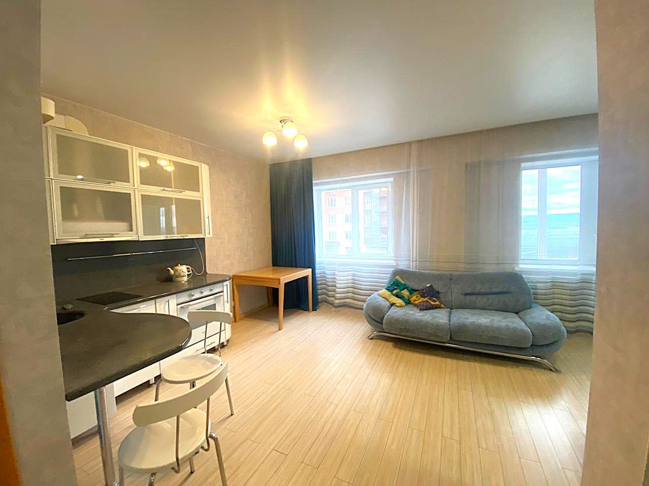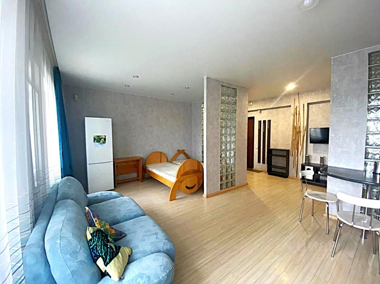 Просторная студия в новом доме! Отличный ремонт! Мебель и бытовая техника есть вся, огромный зеркальный шкаф-купе в прихожей, плазма, кинотеатр. Фото соответствуют! К оплате плюс свет, вода по счетчикам.