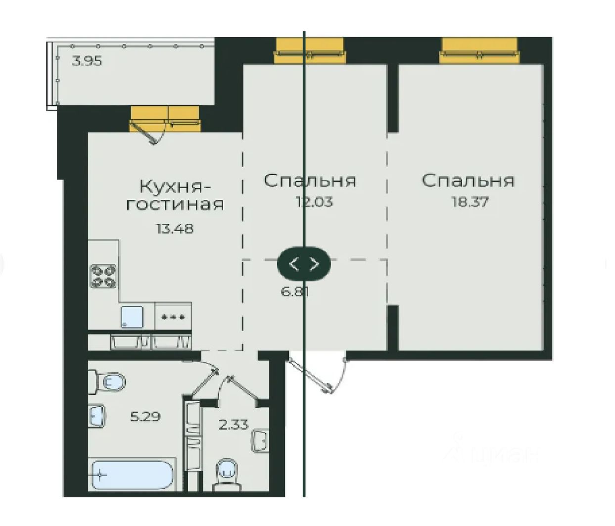 3 комнатная квартира, общая площадь 62,27 кв. м. на 13 этаже 17-ти этажного дома.