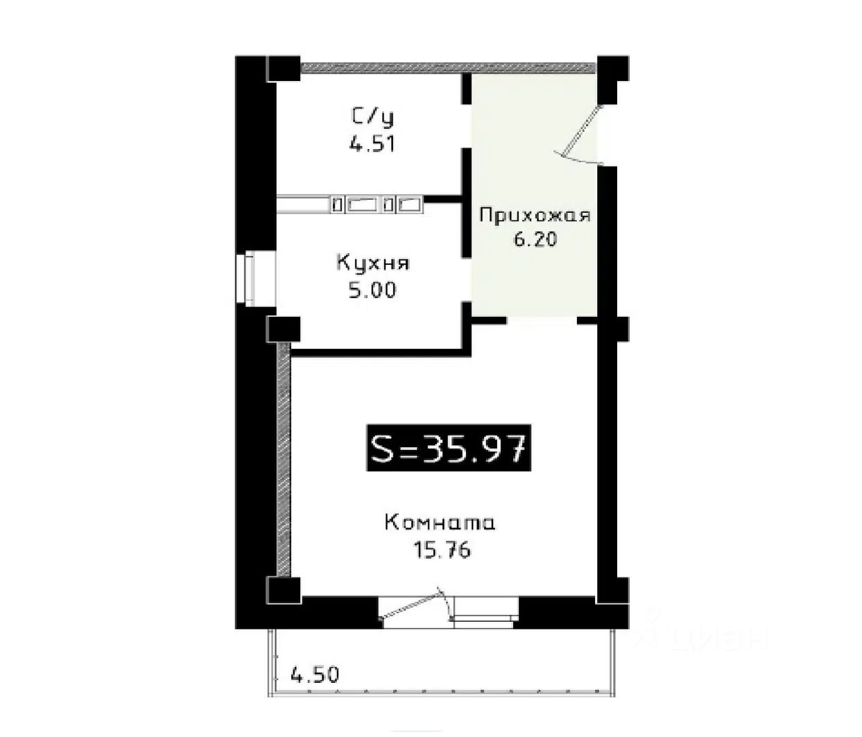 1 комнатная квартира, общая площадь 36 кв. м.