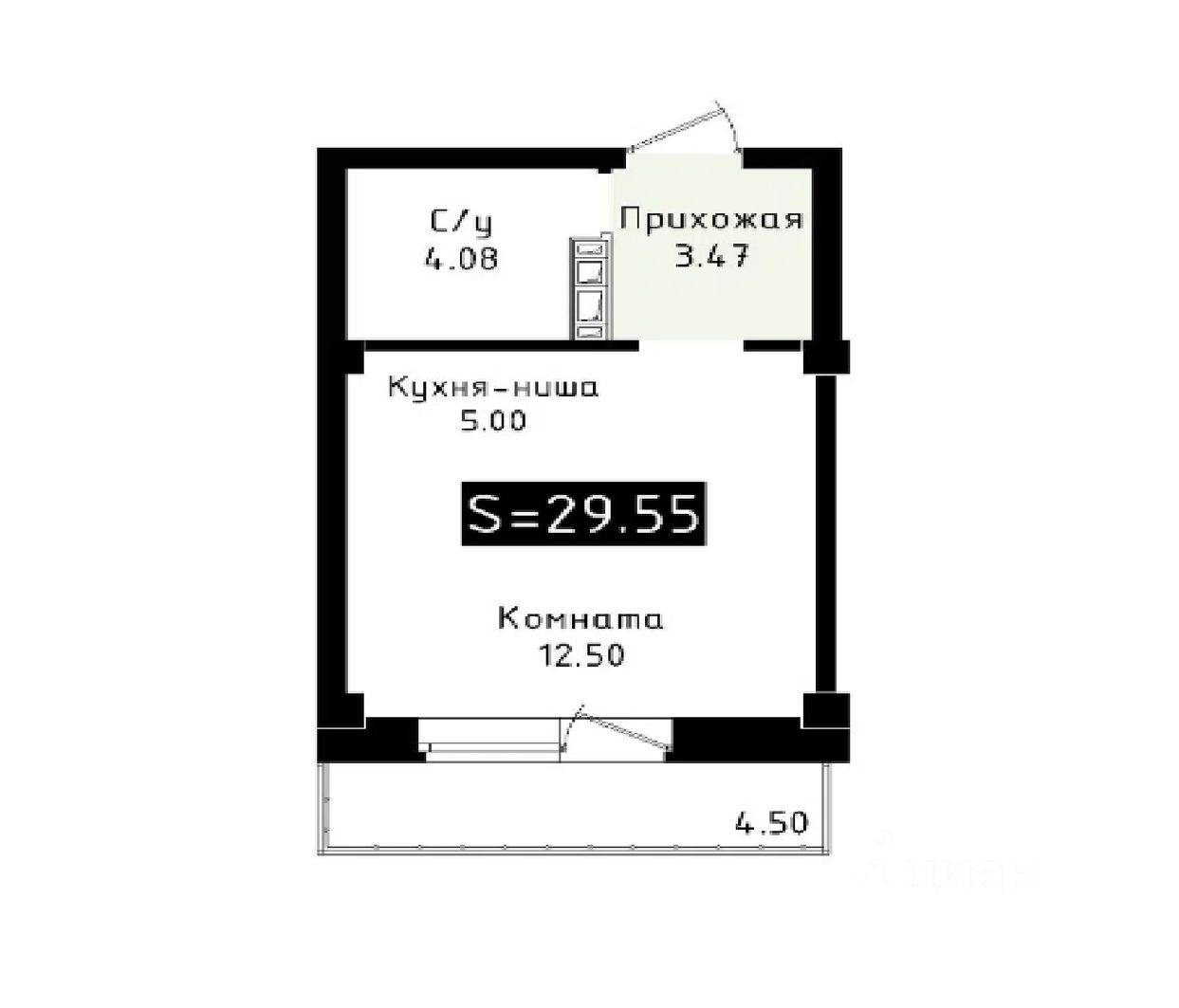 1 комнатная квартира, общая площадь 29,6 кв. м.