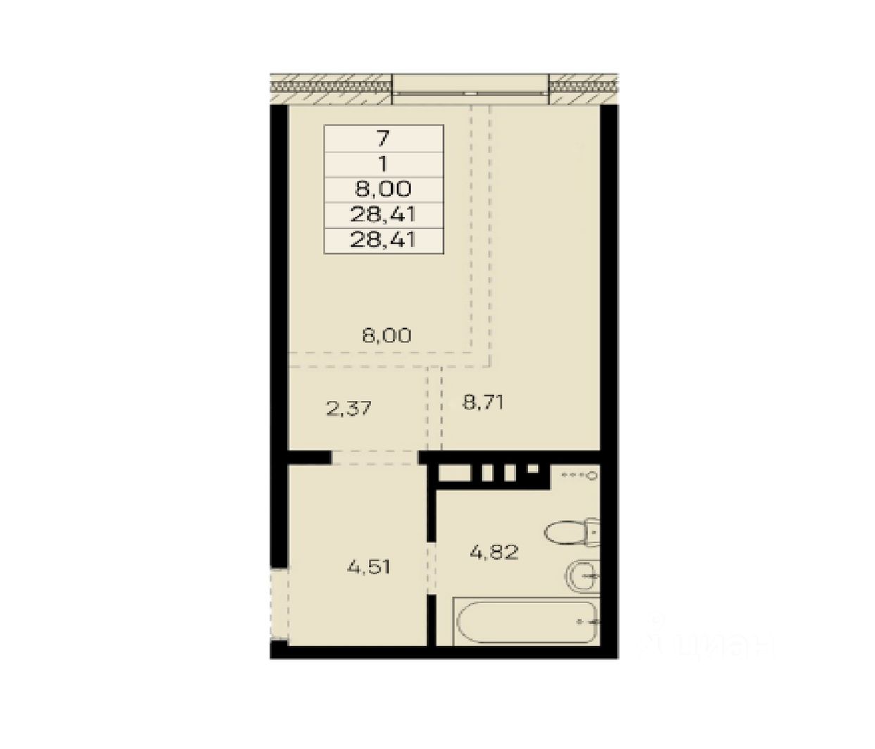 1 комнатная квартира, общей площадью 28,41 кв. м.