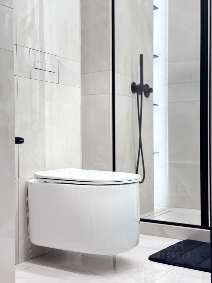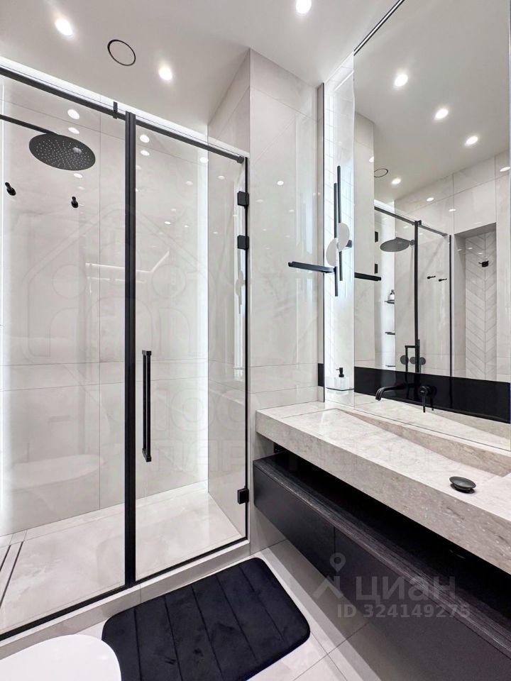 Сантехника скрытого монтажа, дорогой крупноформатный керамогранит, раковина из камня.