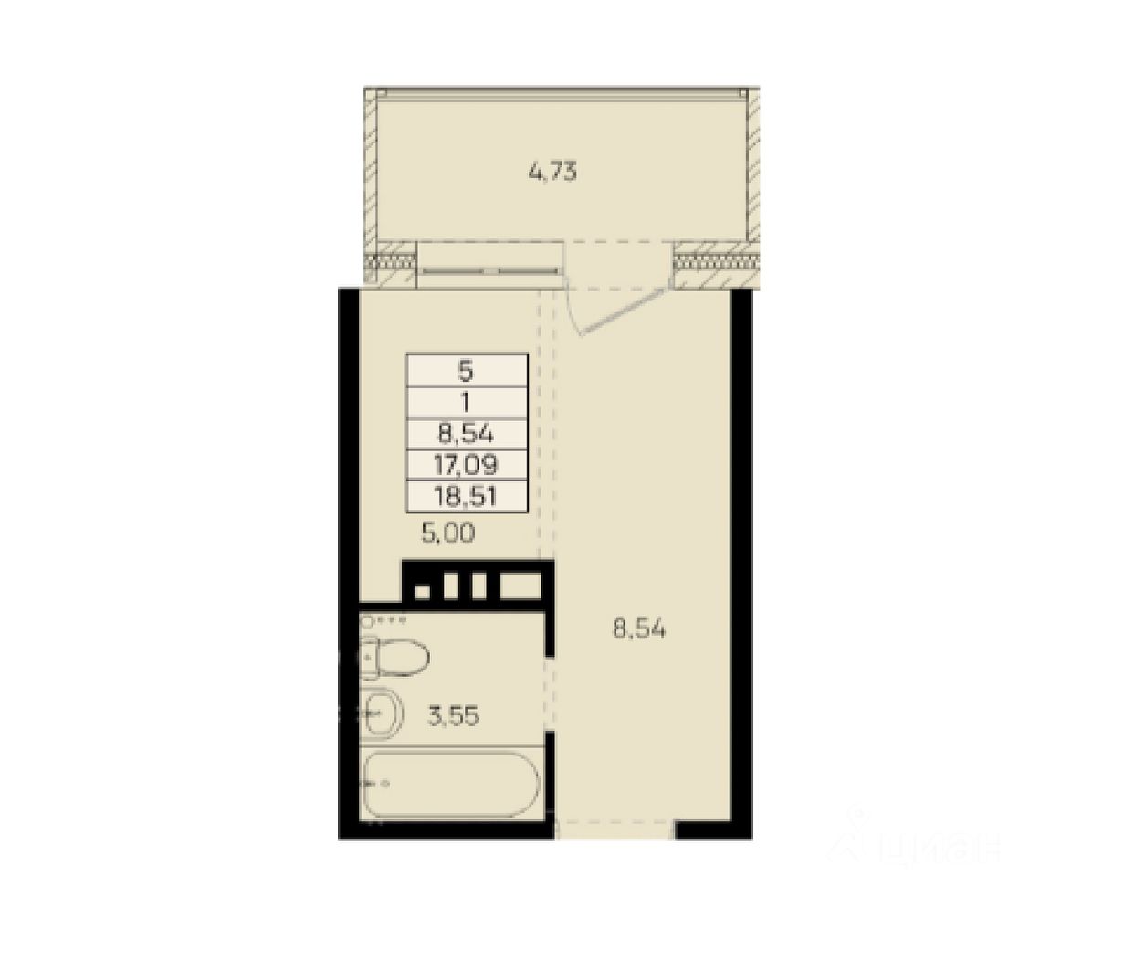 1 комнатная квартира, общей площадью 21,82 кв. м.
