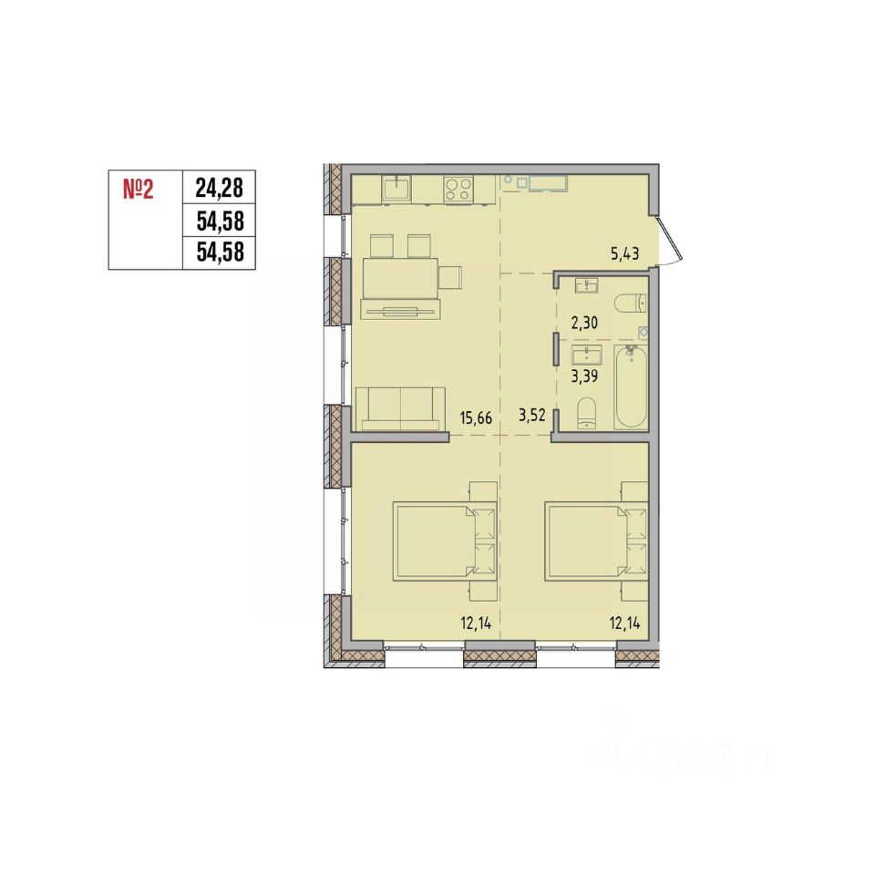 Общая площадь54,58 м2