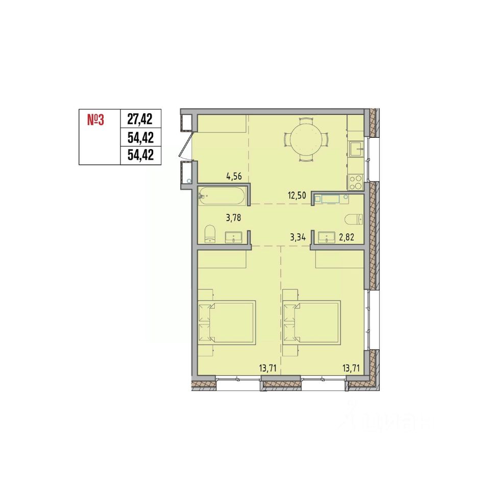 Общая площадь54,42 м2