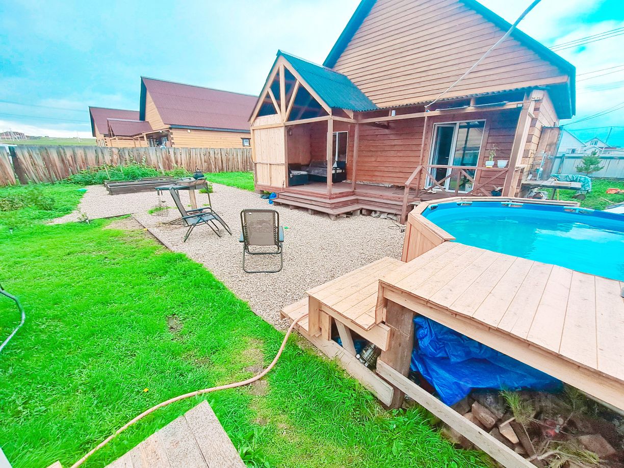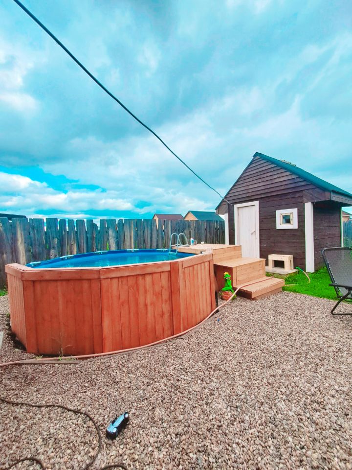 на участке бассейн с подиумом.