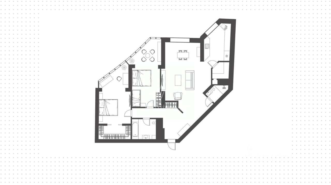 Квартира с двумя спальнями в комплексе бизнес-класса ''Зодиак''. Планировка включает гостиную с обеденной зоной и открытой кухней, мастер-спальню с гардеробной комнатой, детскую комнату, два санузла с ванной и душевой, а также хозяйственную комнату, оснащенную стиральной и сушильной машинами, а также системой хранения бытовых вещей.