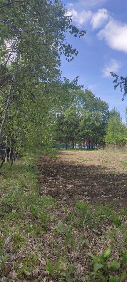 Участок земли, окружённый густым лесом. Деревья, преимущественно лиственные, стоят плотной стеной, создавая естественную красоту.