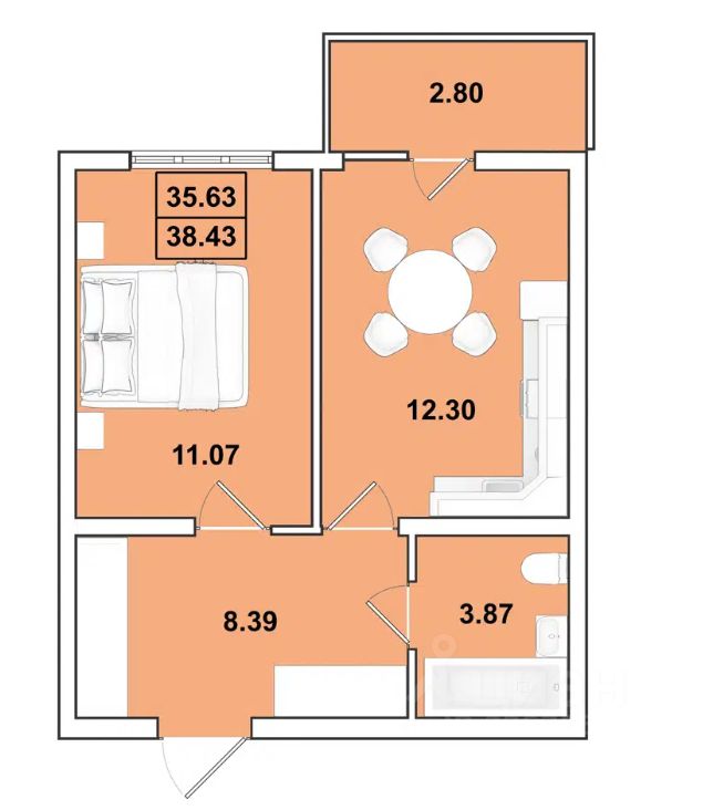Общая площадь38,4 м2