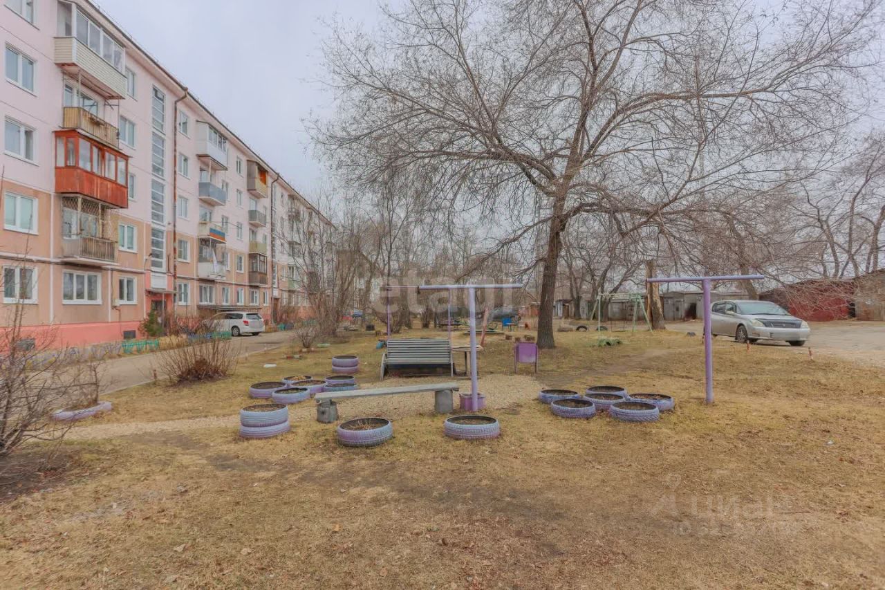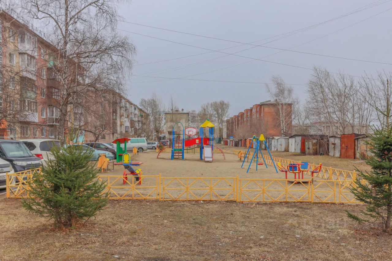 Окна квартиры выходят во двор, где расположены две детские площадки, что делает это место идеальным для семей с детьми.