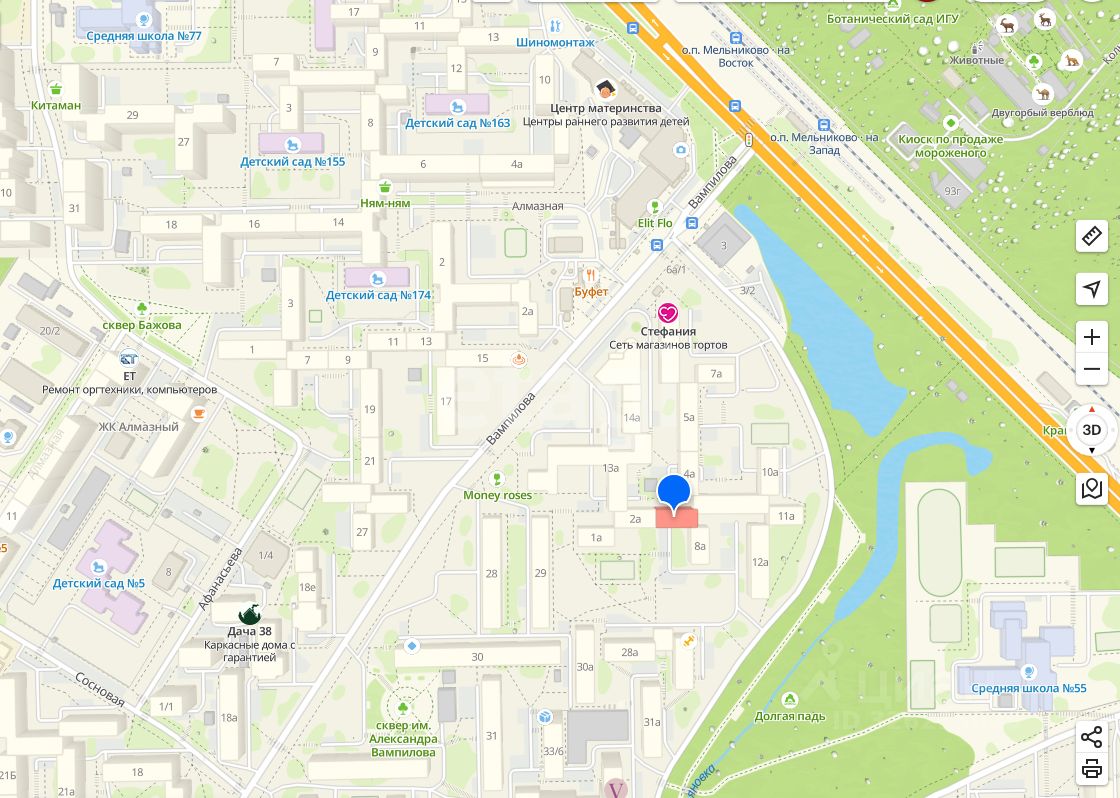 Дом расположен вблизи улицы Вампилова. Остановка общественного транспорта ''Ботанический сад''. Средняя образовательная школа 57, 77. Детский сад 5, 174, 155, 163.