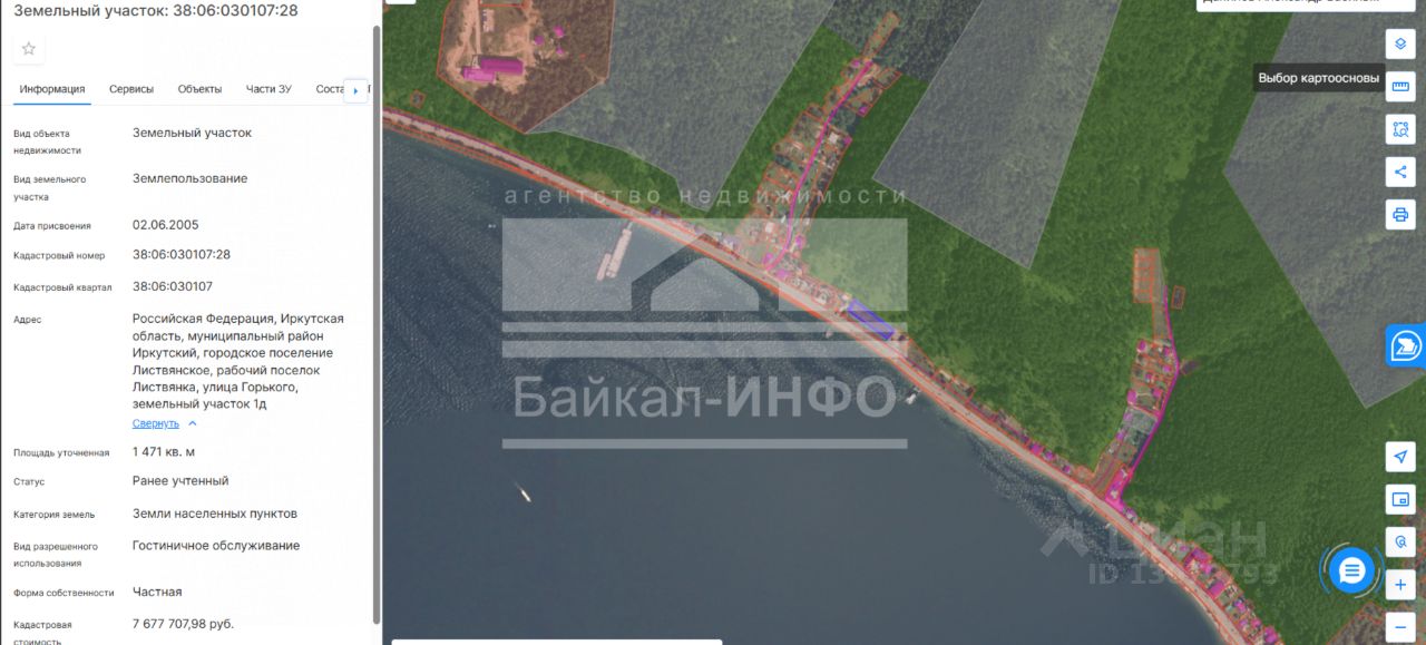 Арт. 131153490 Продаю земельный участок, первая линия, 15 сот. в собственности, п.Листвянка, под строительство гостиницы. 100 кВт код. ном. 38:06:030107:28