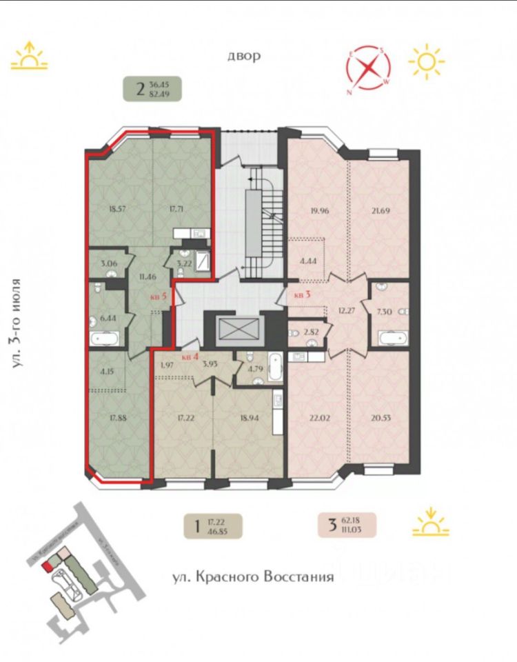 Арт. 129847140 Эксклюзивно! Целый этаж в сердце Иркутска. Ваше родовое гнездо 238,6 кв. м. Уникальное предложение для тех, кто ищет пространство для жизни без компромиссов. В Клубном доме ''Бабр'' продаётся целый этаж с видом на динамичный ритм центрального района. Это не просто квартиры, это — ваше идеальное пространство! Три независимые квартиры на одном этаже, которые можно объединить в одну роскошную просторную резиденцию площадью 238,6 кв.м. Состав этажа: 3-комнатная квартира — 109,7 м 2-комнатная квартира — 82,6 м 1-комнатная квартира — 46,3 м - Ваши безграничные возможности создать просторные апартаменты для семьи. Организовать приватный домашний офис и гостевые зоны. Сохранить планировку для сдачи в аренду премиум-класса.